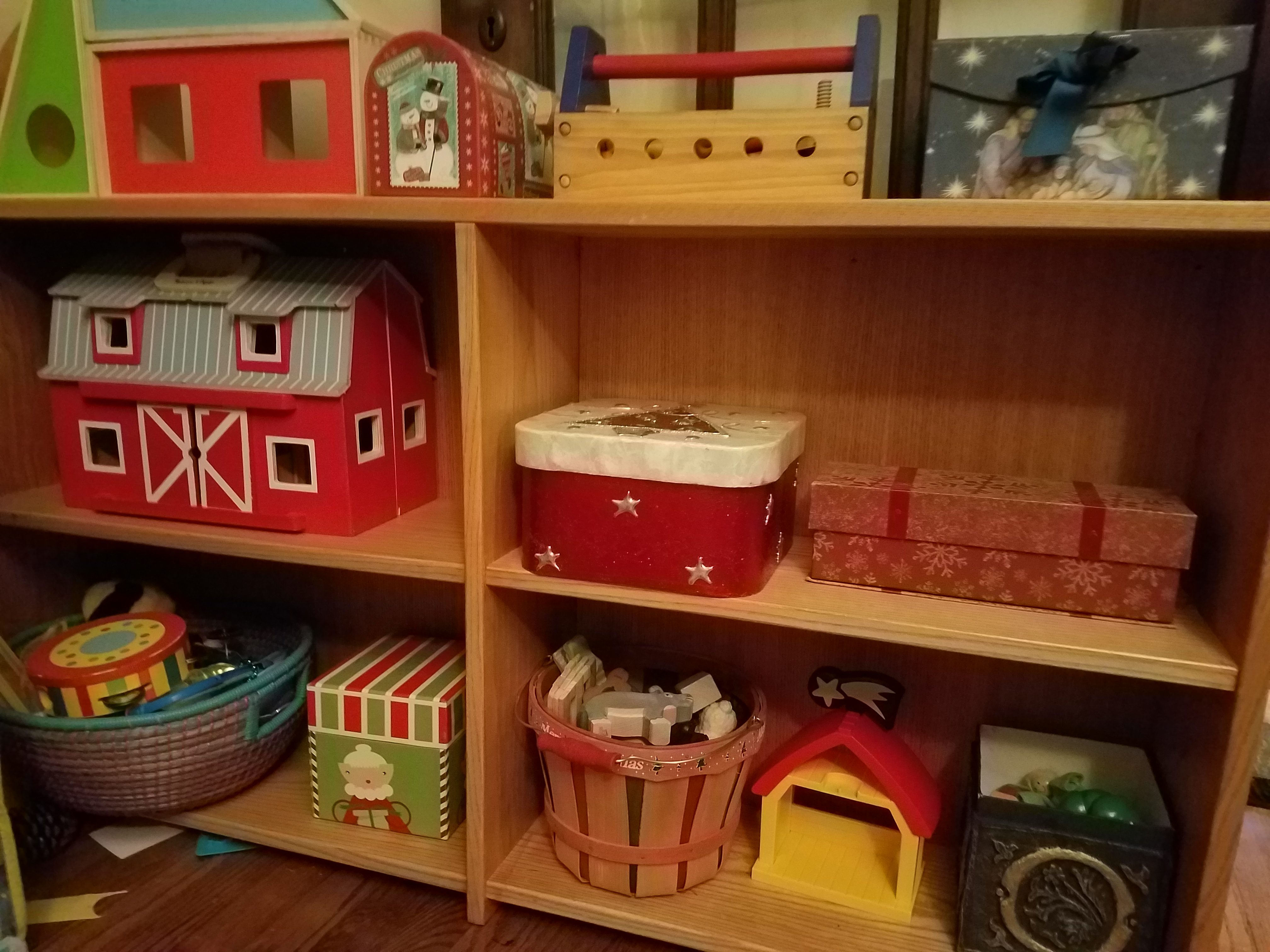I also add a Nativity Set to their toys for the season. A few years back I found a very sweet wooden one at my favorite thrift store, and the kids love, love, love playing with it each year.