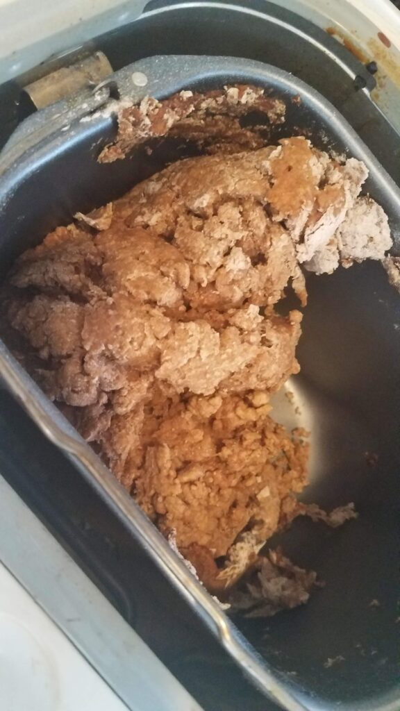 I had my act together this morning. I was on top of things and for once managed to get bread going first thing in the morning so it would be ready for lunch (mental note: I really need to make more already prepped bags). Except that apparently, the paddle on the bread machine wasn’t all the way attached, so my bread turned out like this: