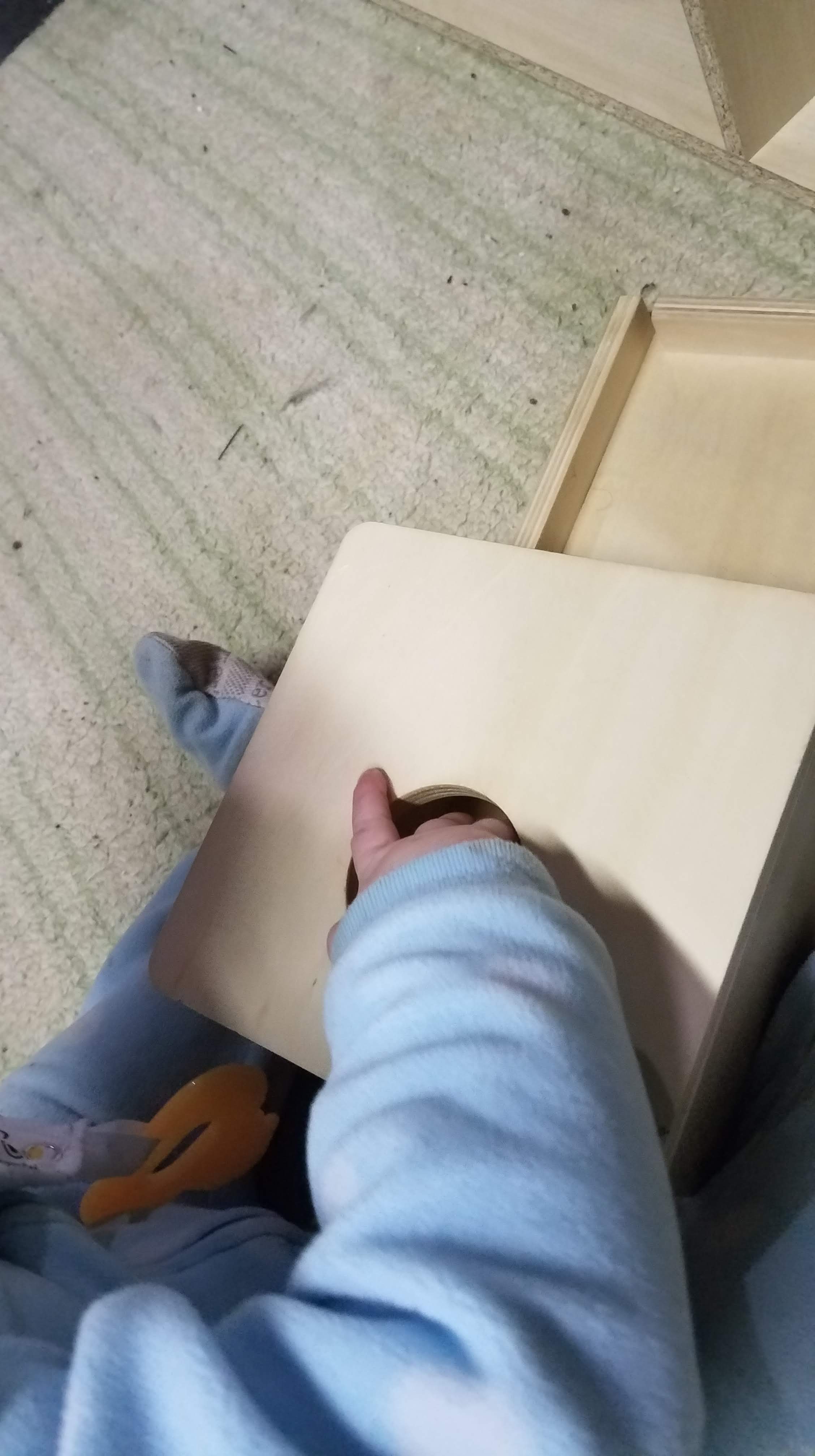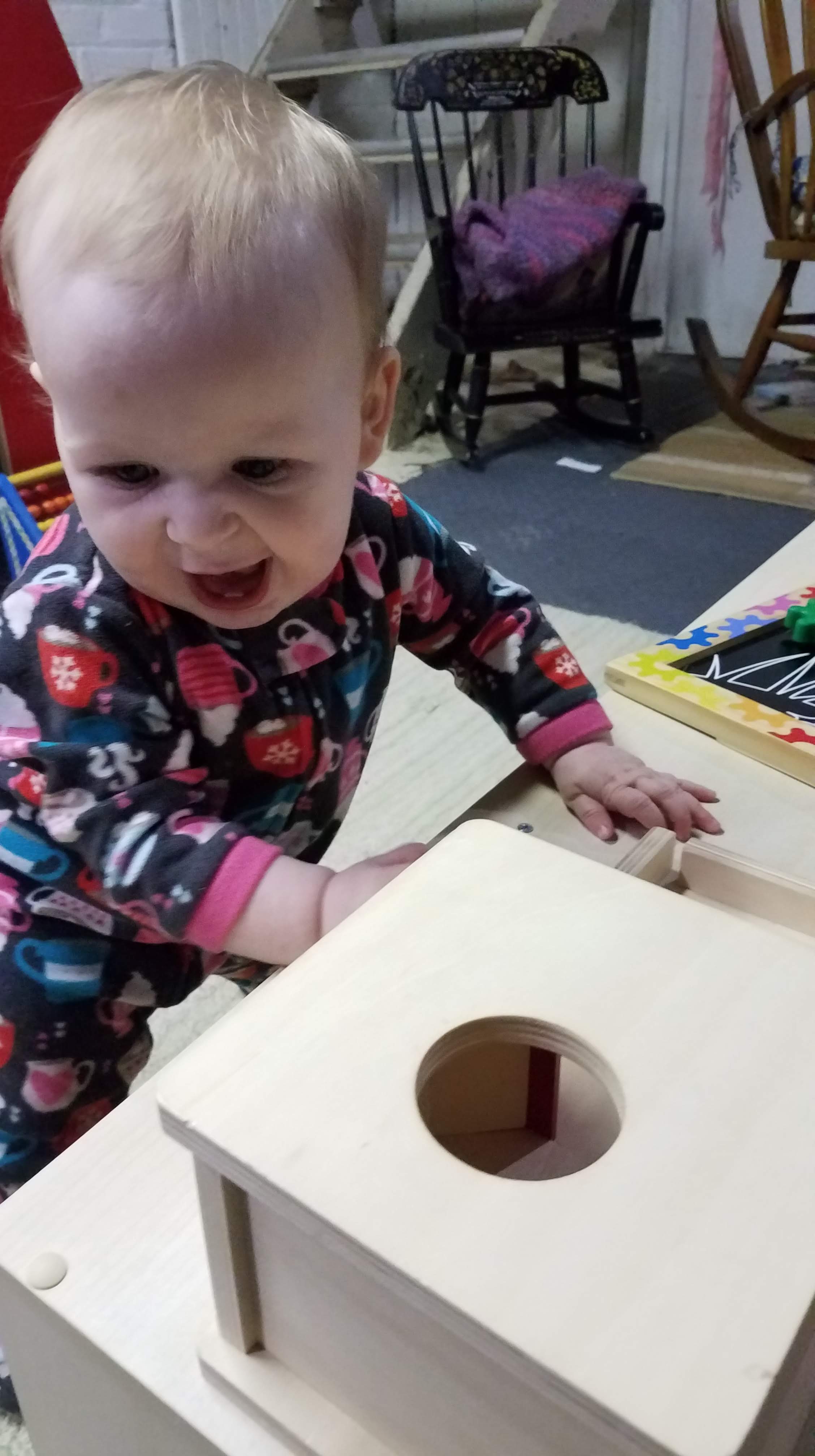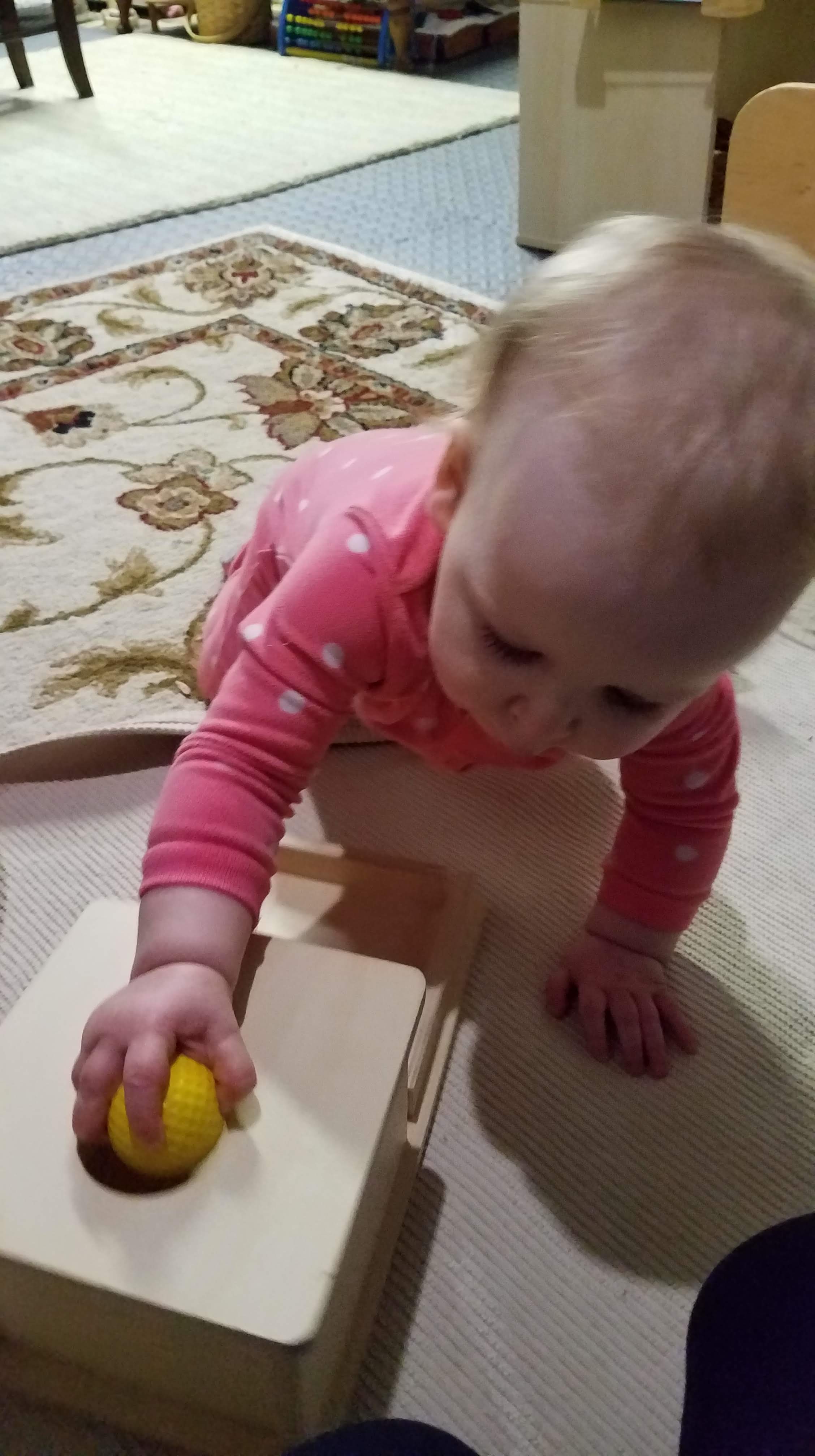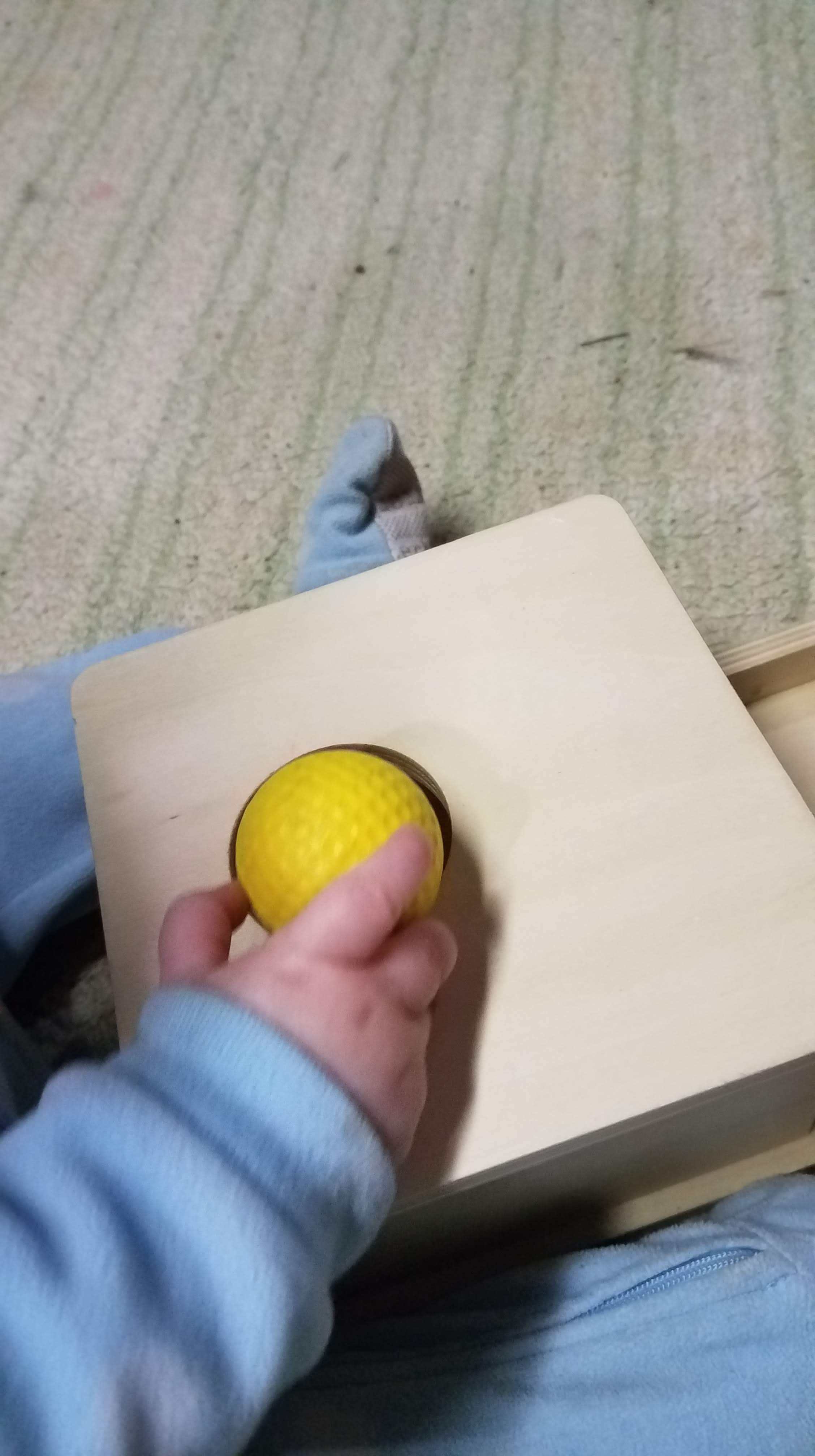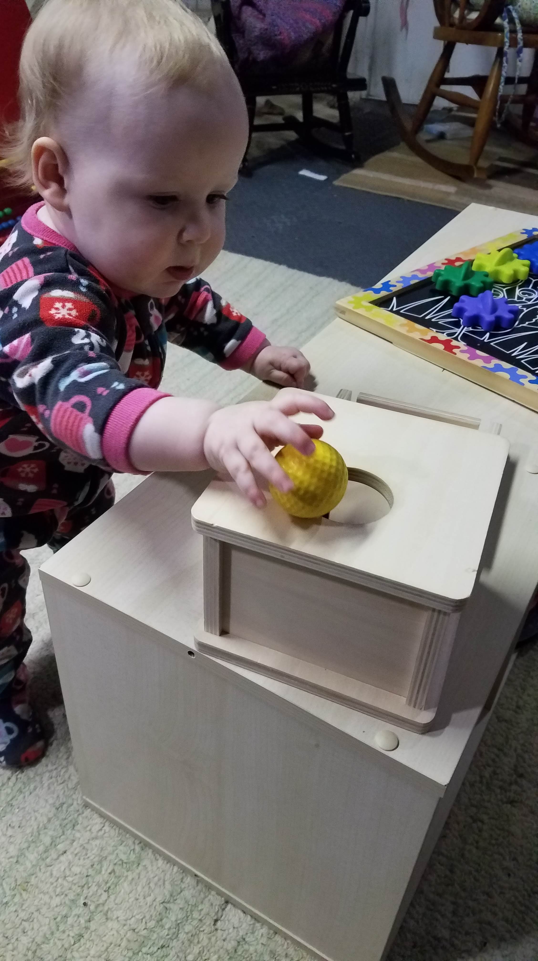 The Object Permanence Box is quite simply, a box, with a hole in it and a bottom that is slightly tilted. It comes with a ball. The baby puts the ball in the hole, and it rolls out onto the tray. Then they do it again. And again. And again. It is endlessly fascinating and quite amazing.