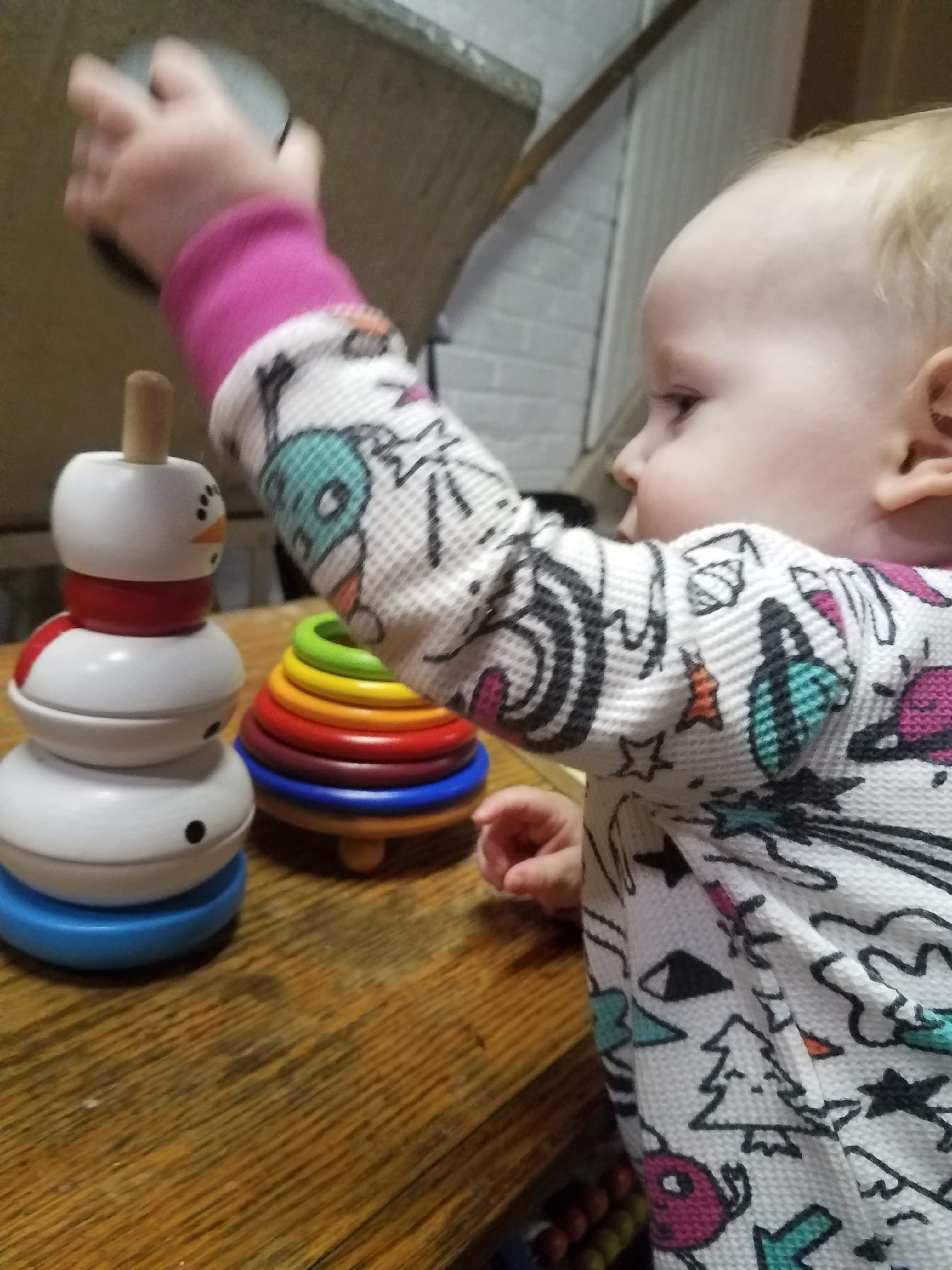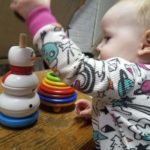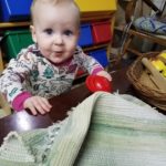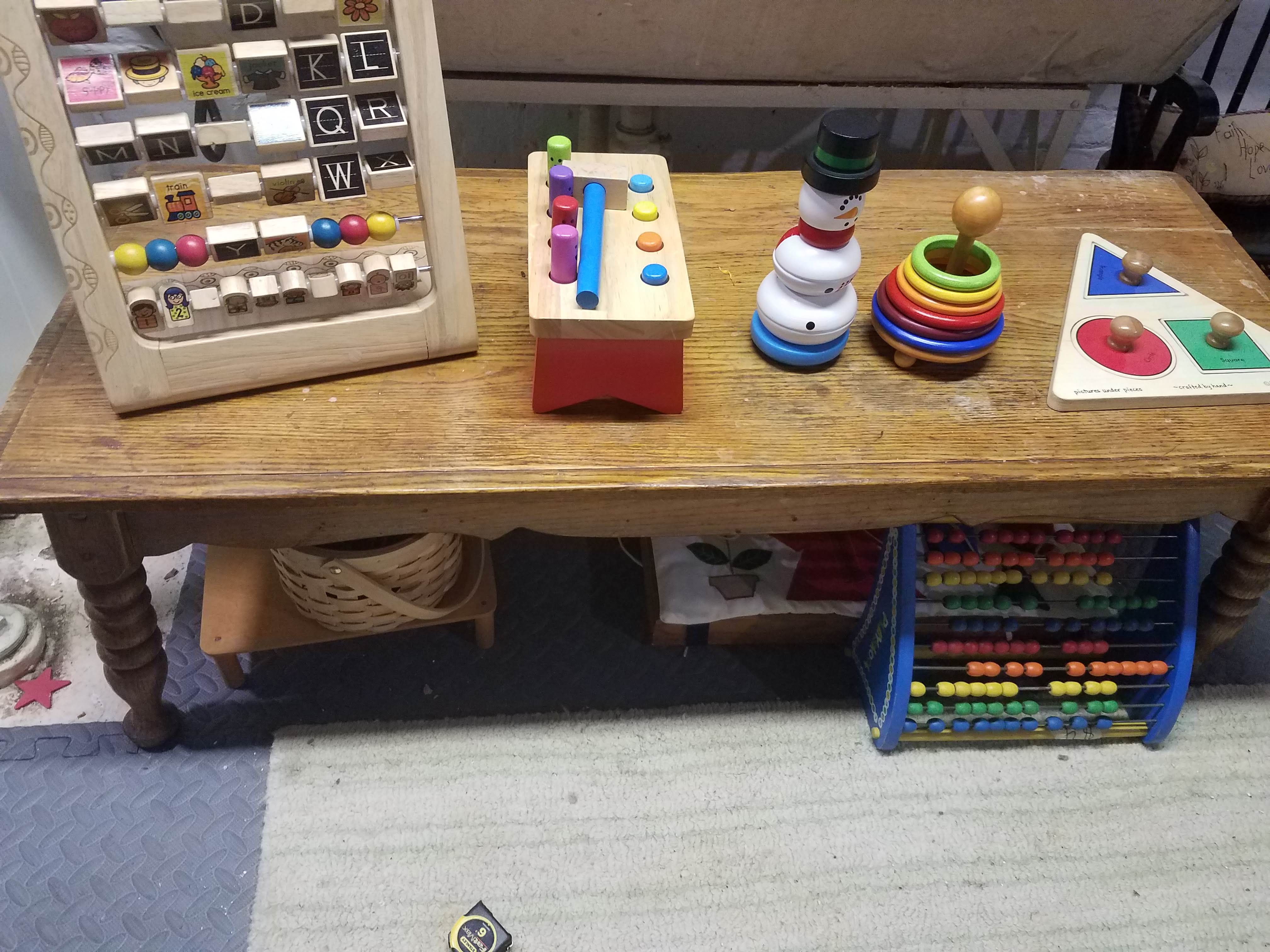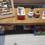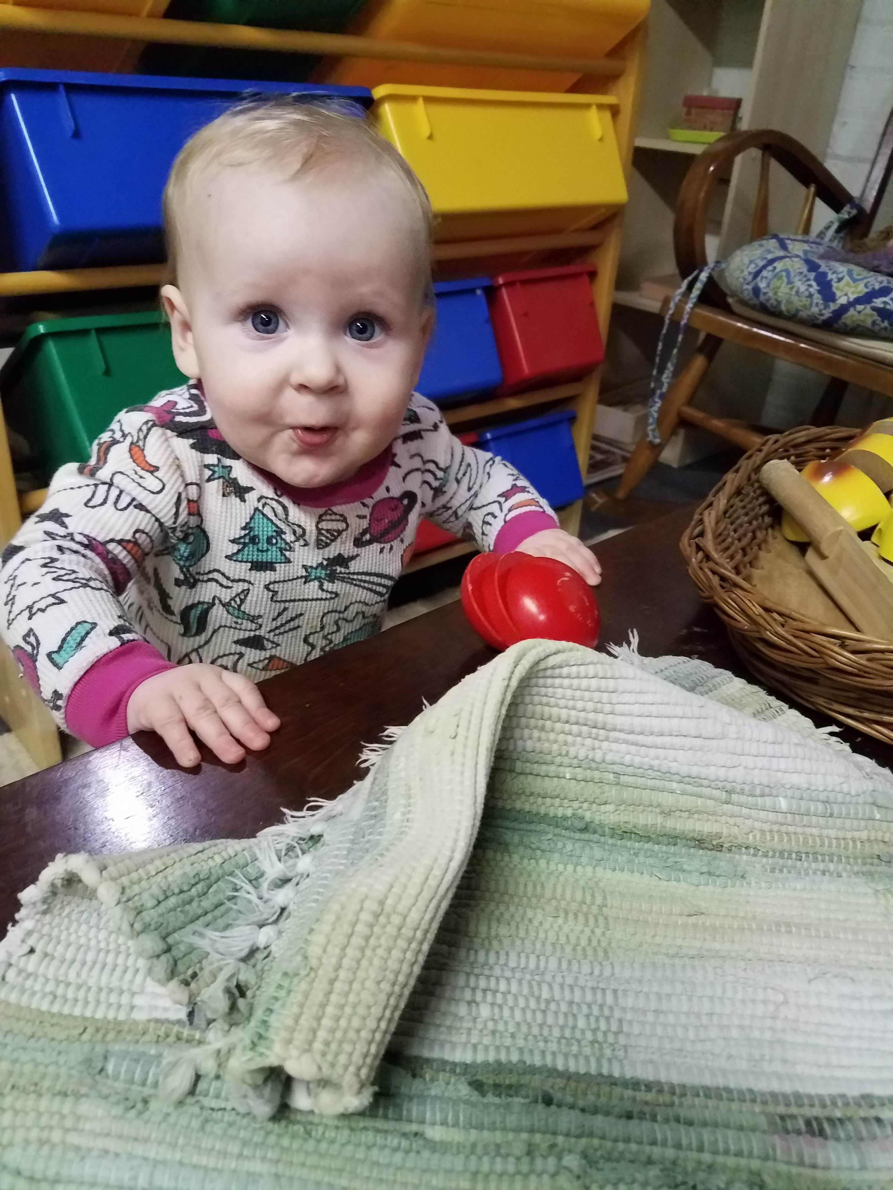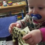 The long, low table now holds works that are designed to catch her eye. The table is the perfect height for her to stand at, which is her favorite posture currently, and are positioned such that she can easily explore them while she stands at the table.