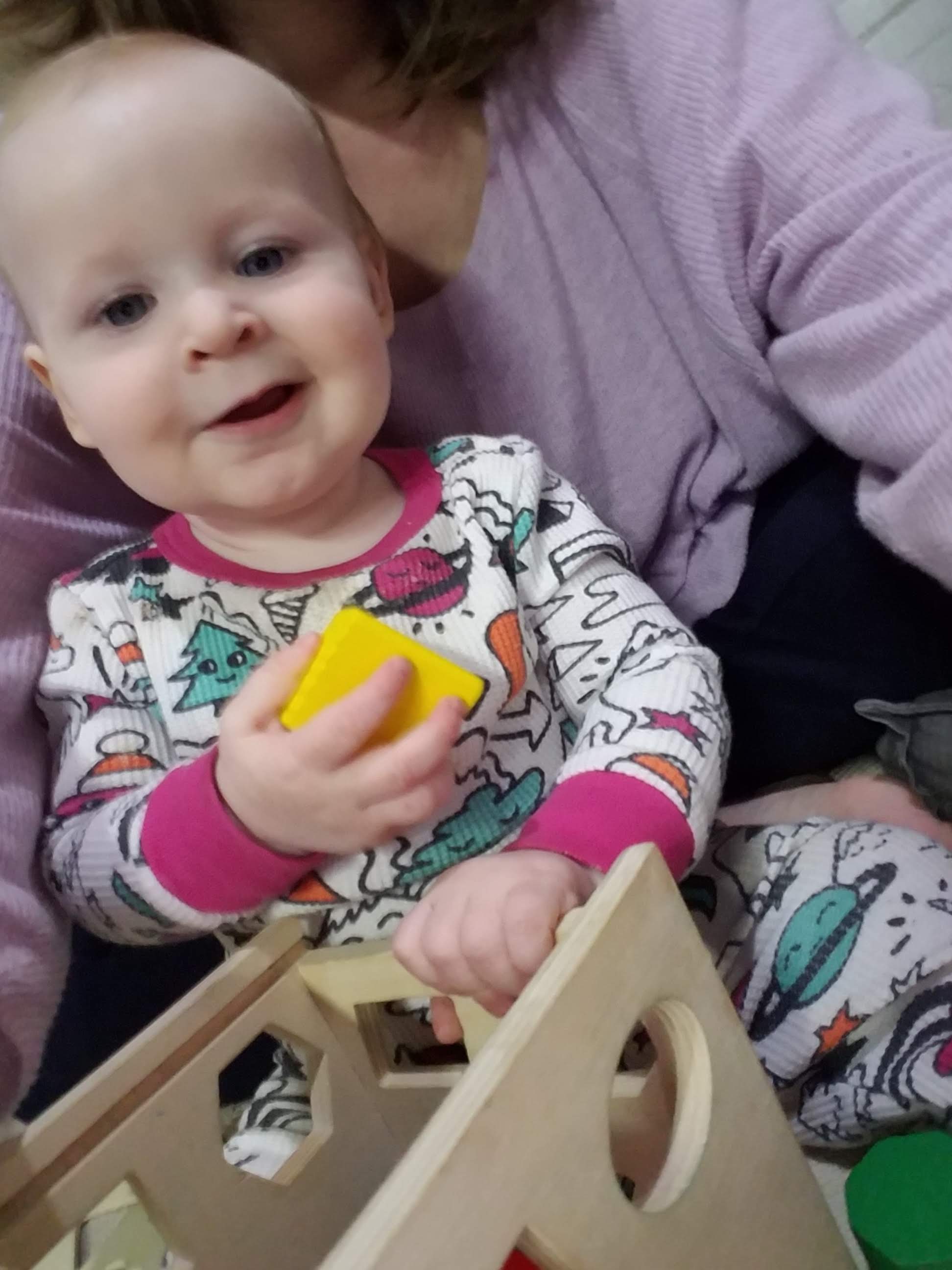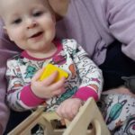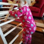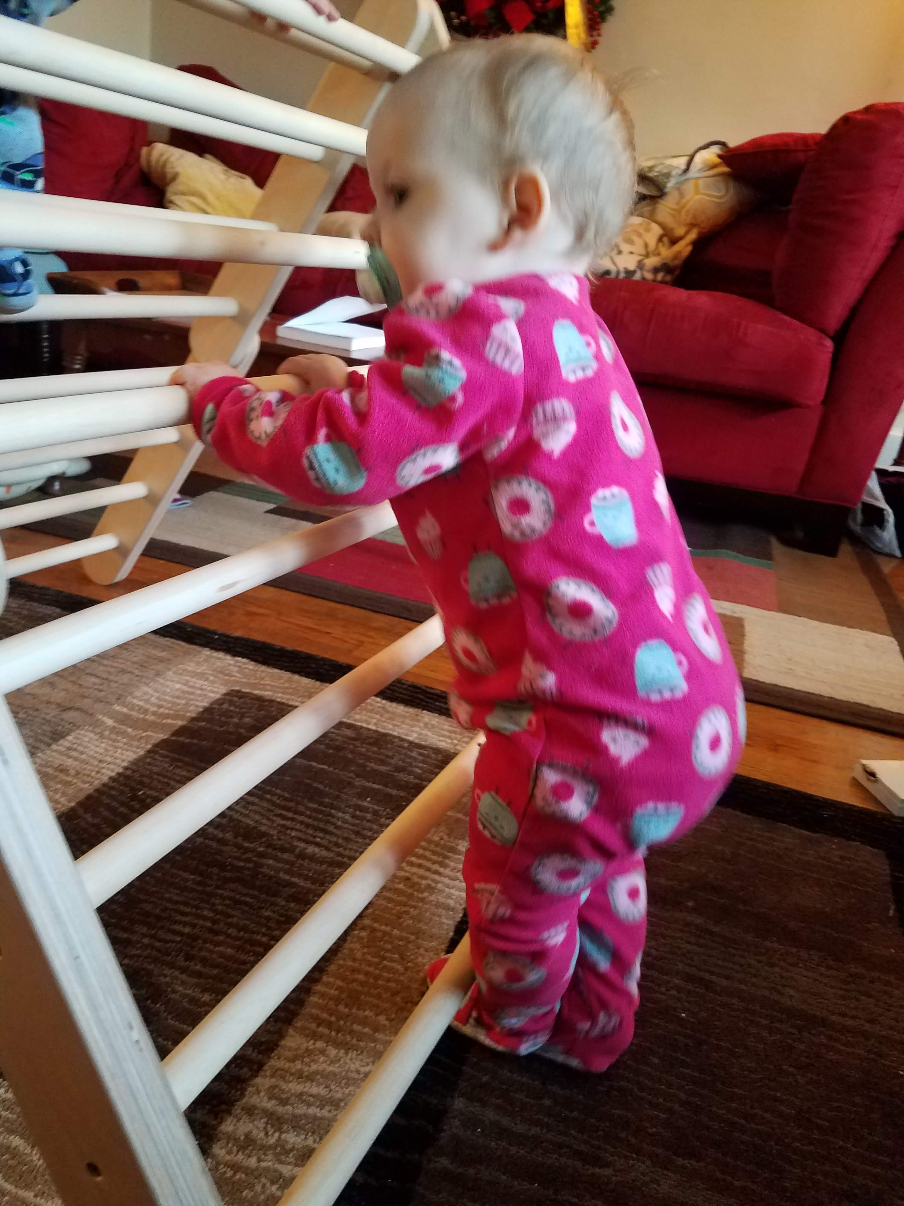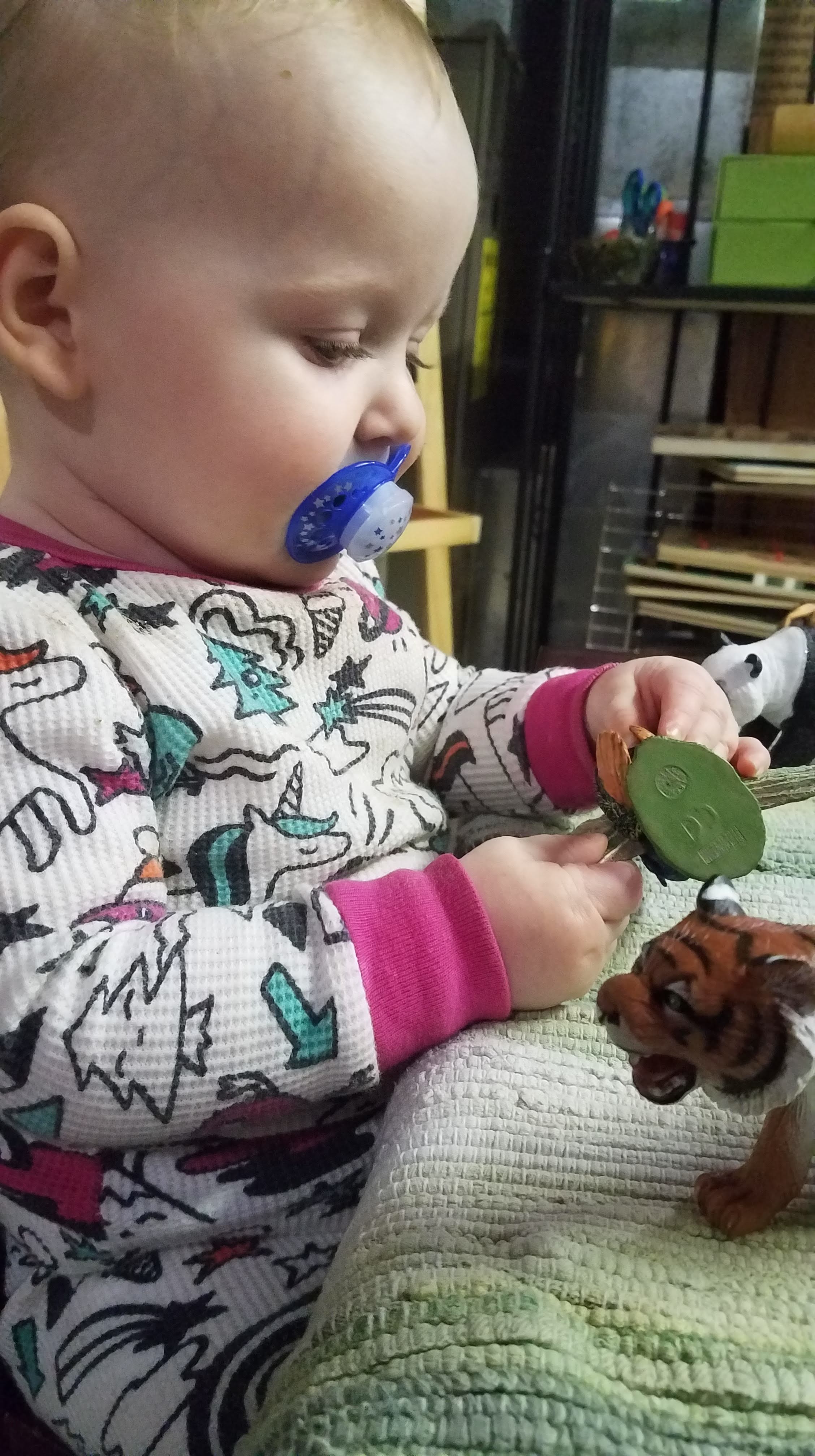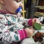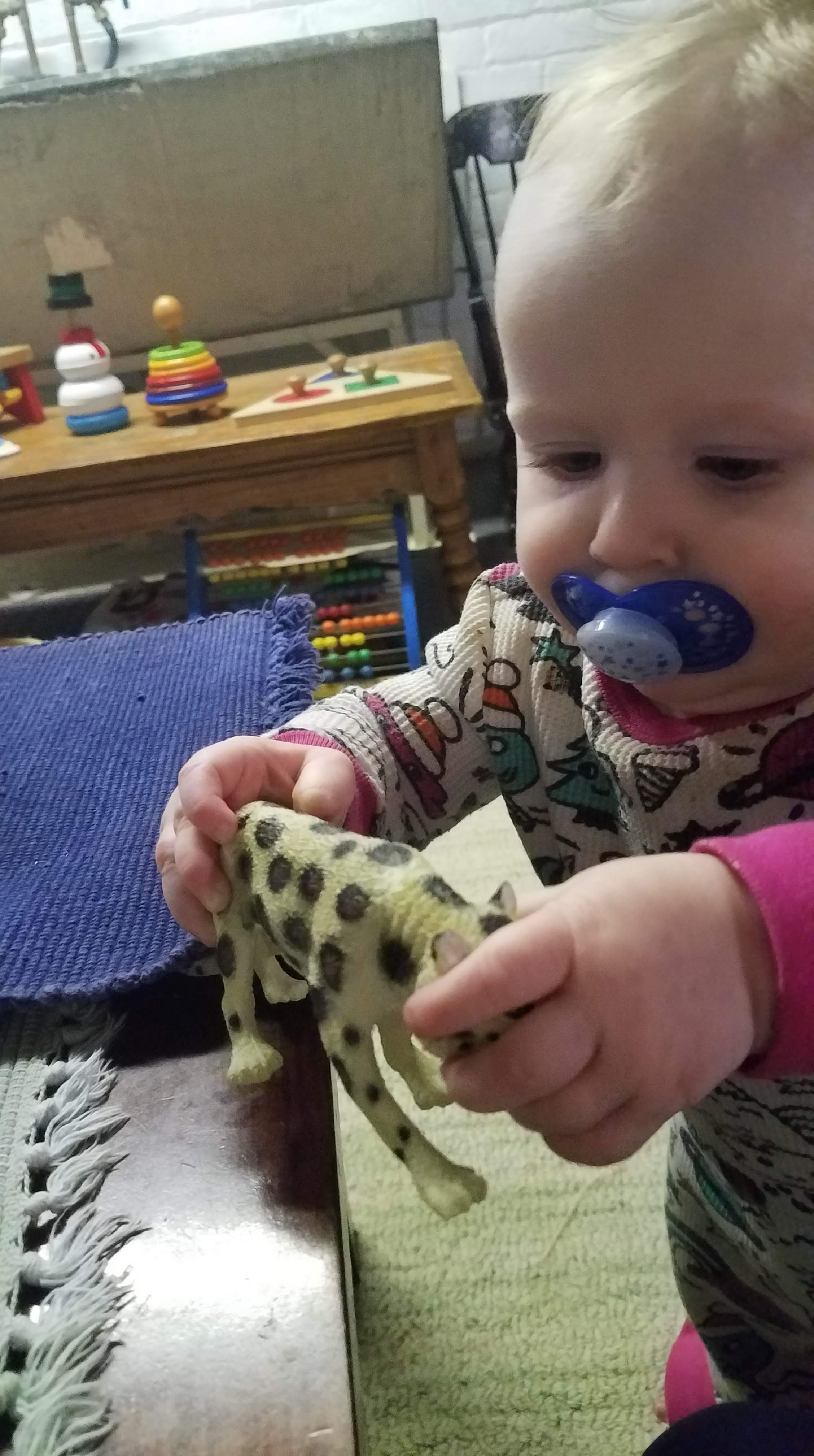 The long, low table now holds works that are designed to catch her eye. The table is the perfect height for her to stand at, which is her favorite posture currently, and are positioned such that she can easily explore them while she stands at the table.