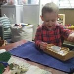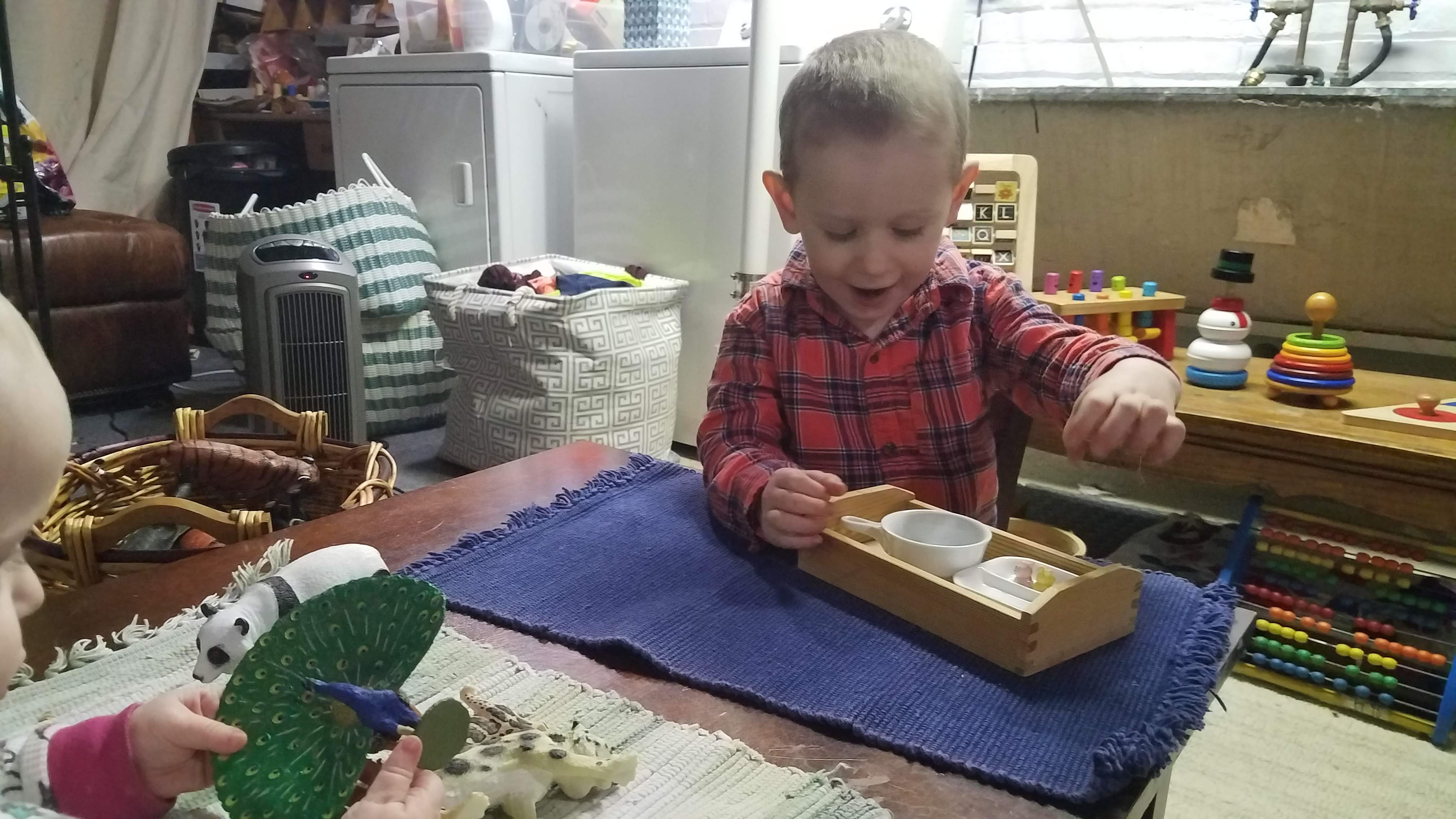 The practical life works have moved. These are the works with the tiniest pieces in the classroom. They are our scooping and pouring and tonging works, so it means lots of tempting things for little hands and little mouths. They used to be on the long, low oak table where they were easy for William to notice. Now that he is used to finding them and knows that he enjoys working with them, I have moved them to a taller bookcase that is slightly out of the way- it is much less likely that Charlotte will get into them there.